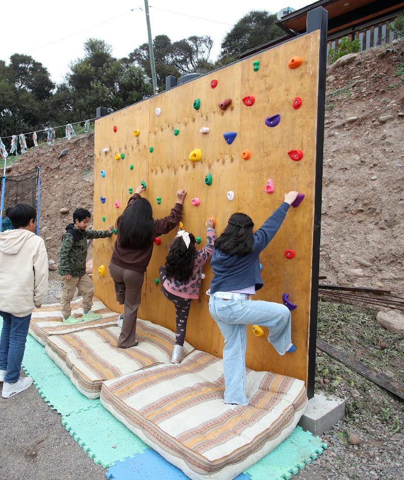 Espacio abierto con entretenidos juegos psicomotores, cama elástica, muro de escalada y circuito motor.